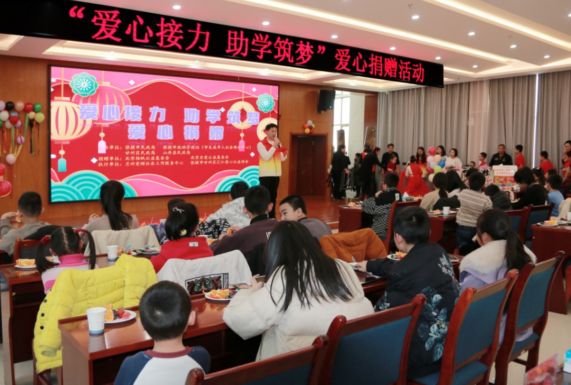 為進一步關心關愛困境未成年人,凝聚社會各界力量以實際行動當好兒童成長的引路人、兒童權益的守護人、兒童未來的逐夢人,助力未成年人生活有保障、困難有幫扶、心靈有關愛,確保他們溫暖過冬、幸福過節,1月25日,張掖市民政局、市救助管理站(市未成年人社會保護中心)聯合山丹縣民政局、蘭州愛頤社會工作發展中心、甘州區匯仁愛心公益協會共同舉辦“愛心接力 助學筑夢”愛心捐贈活動。共青團市委、市婦女聯合會、市關工委、市教育局等部門領導、受助學生、愛心志愿者等100余人參加活動。