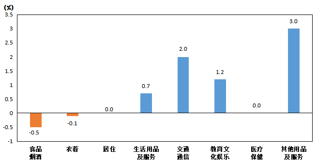 其他七大類價格環比“四漲一降二平”。其中,其他用品及服務類價格上漲3.0%,交通通信類價格上漲2.0%,教育文化娛樂類價格上漲1.2%,生活用品及服務類價格上漲0.7%;衣著類價格下降0.1%;居住、醫療保健類價格與上月持平。